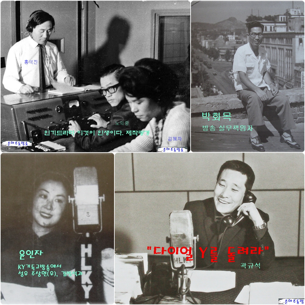 ![]() 1954년 12월 15일 오후 6시! 최초의 민영방송 첫 방송, 창사 특집드라마와 성경공부, 축하음악회, 어린이시간 등, 이 방송의 성격이 그대로 반영된 4시간 30분의 창사 특집방송이 울려 퍼졌다. 최초의 민영방송 기독교 방송 HLKY (2-방송 편)KBS에서 활동하던 박화목을 교양과장으로 이보라를 연극과장으로 영입 하면서 출발한 CBS 기독교방송은 종교방송을 주축으로 하면서도 수준 높은 드라마와 음악방송을 편성 신선한 충격을 주면서 청취자들의 관심을 끌어 시청률을 높여 나갔다. ![]() 창사특집 편성표 창사특집 박학림 작 귀로에 이어 창사 때부터 드라마에 역점을 두어 1955년의 대원군, 1957년부터 방송된 한운사 작 “이 생명 다 하도록” 조남사작 “수정탑”등의 멜로드라마는 청취자들의 마음을 끌었고 특히 KY에서 출발한 주태익은 KY성격을 잘 보여준 「루터런 아워」등 수많은 명작으로 KY 위상을 높이며 대작가가 되었다. ![]() ![]() ![]() ![]() 이보라, 민구(윤인자 남편) 등 연출가가 활동했고 복혜숙, 윤인자, 장민호 등 연극, 영화, 방송에서 두각을 보여준 원로성우들이 출연하면서 자체 성우도 선발 양성 해 나갔다. CBS초기 두 명의 성우를 뽑는데 200여명의 지원자가 모여들 정도로 인기가 있어서 정은숙, 임옥영, 맹관영 (뒷 날 TBC, KBS 명 아나운서) 등은 타 방송사에서도 훌륭한 연기를 보여준 성우를 배출했다. ![]() 위 조남사 작 민구연출, 서월영 윤인자 출연 수정탑 아래 왼쪽부터 김범석, 윤인자, 주상현 ![]() ![]() 위 강효실 아래 전원주 ![]() ![]() 위 : 1957년 KY 일일 연속극 이 생명 다 하도록 작가 한운사, 출연 백민, 김성원, 김영배, 유기현 아래 : 윤인자, 주상현, 천선녀, 임옥영 ![]() ![]() 위 : HLKY 초기 성우 (미국의 소리 방송에서) 들이 함께 한 사진이다. 좌로부터 정건우, 맹관영, 임옥영, 한경돈, 정은숙 , 김영배, 연출 : 홍석진 아래 왼쪽부터 전원주, 두분 넘어 임옥영, 맹관영 한분건너 연출 : 이보라 ![]() KY가 80회 또는 120회의 연속 멜로드라마를 방송하면서 KBS드라마와 함께 우리 생활 속에 깊숙이 자라잡기 시작, 1960년대의 또 다른 새로운 민영방송이 출현하고, 라디오방송 전성시대를 맞으면서 드라마는 방송의 꽃으로 불렸다. CBS 출신 성우 김성원, 이우영, 유기현, 김영배, 정은숙, 천선녀, 유병희, 서계영, 임옥영, 나옥주, 맹관영 ![]() ![]() ![]() (위) KY 뮤직홀 내부, (중) 개소때의 뮤직홀 (아래) 음악 스튜디오 KY에서 단연코 많은 비중을 차지한 방송은 음악이었다. 국내에서 레코드 제작이 어려웠던 시절 미국에서 질 좋은 대량의 LP판을 들여와 청취자들의 호응을 받으면서 음악 프로그램 60%를 넘을 때도 있을 정도로 중시되었고 제한된 시간의 방송만으로는 청취자들의 욕구를 충족시키기 어려웠기에 국내에서는 최초로 대규모 뮤직홀을 세워 수준 높은 음악을 들려주기도 했다. 상대적으로 어려움을 겪던 KBS가 LP 레코드를 직접 만들어 보급 하기도 하던 시절이었다. ![]() 위 창경원에서의 공개방송 아래 KY 국악의 향기 ![]() 초창기의 KY뉴스는 KBS를 받다가 1958년부터 동화통신 등 타 언론사와 제휴 하는 한편 미국 VOA를 중계 방송하다가 4.19가 일어나자 KBS가 국영방송의 한계를 벗어나지 못하고 어려움을 겪고 있을 때 KY는 바른 보도를 통해서 전 국민의 사랑받는 방송국으로 발돋움했다. ![]() 종로 2가에 자리하고 있던 KY건물에서 바라다 보이는 광화문과 종로의 시가행진 모습을 보면서 모든 직원들은 뉴스현장으로 뛰었고 통신이나 신문 등을 방송 그 속보성을 바탕으로 청취자를 끌었다. 발음이 정확치 않아도, 문 법이 틀려도, 방송에 잡음이 실려도 급변하는 소식에 목말라하는 국민들은 이 방송에 귀를 기울였던 것이다. 이렇듯이 4.19는 KY위상을 한층 더 높였고 60년대 민영방송 경쟁대열에서 기독교를 배경으로 한 KY 보도는 돋보였다.. 보도방송의 진가를 알게된 CBS는 1962년 방송부에 보도실과 아나운서실을 신설하고 뉴스를 정기적으로 방송했다. 그러나 재정적으로는 어려운 상황이 오기 시작했다. 미국 뉴욕에 있는 RAVEMCO. 방송 전도담당 매스컴 위원회 지원으로 운영 되었지만 60년대 들어 지원이 감소 된대다가 민방의 출연으로 청취자까지 잃게되자 광고방송을 추진해서 1962년 9월 12일 광고 허가신청서를 제출 받아들여져 1963년 4월 12일부터 전체방송시간의 30% 이내로 광고방송을 할 수 있게 되었다. ![]() ![]() 위 : 어린이 동화대회에서 우승컵을 주고있는 오재경 이사장 아래 : 70년대에 KY 가 배출한 두 세계적인 음악가 정경화 : 조수미 ![]() 외국인이 방송국 대표가 될 수 없다는 법률개정에 따라 감의도님이 방송일선에서 물러나고 잠시 어려움을 겪기도 했지만 1970년 들어 경영과 방송을 겸비한 오재경 이사장이 취임하면서 무보수 특별봉사를 표방하고 노력을 기울임에 따라 KY는 국민 곁으로 한 발자국 더 다가섰으며 보도 논평에 획기적인 변화를 가져오기도 했다. 많은 보도기자를 새로 뽑고 내용이 쇄신되었으며 유신독재 하에서 언론들이 숨죽이던 때도 KY는 갈 길을 갔다. 보도방송시간도 50분대의 10분간의 방송에서 30분대의 30분간의 방송으로 늘렸다. 그러나 1970년대 말의 10.26과 5.18을 지